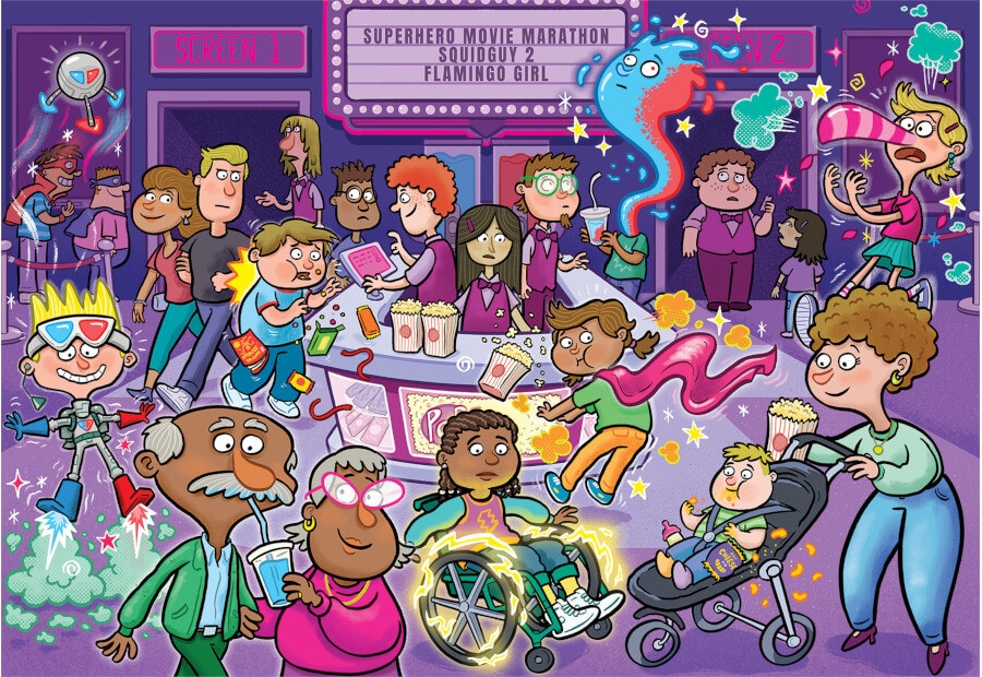 It’s the ultimate superhero movie marathon at the cinema and everyone is lining up for popcorn, sweets and slushies! All of a sudden, strange things are starting to happen around the snacks counter…